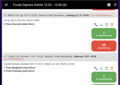 Per Klick kann der Kunde telefonisch kontaktiert oder die Lieferadresse auf einer Karte betrachtet werden. Erledigte Bestellungen können archiviert und falsche Bestellungen storniert werden.
