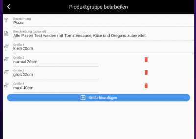 Der Shop ist unterteilt in Produktgruppen (beispielsweise Pizza, Pasta, Salat,..). Für jede Produktgruppe können, sofern benötigt, Größen und Optionen definiert werden. Die Optionen diesen Beispielsweise für die Auswahl eines zusätzlichen Beläge, die Auswahl der Brotsorte, oder die Wahl eines Dressing. Natürlich kann für jede Option ein Preisaufschlag/Abzug definiert werden.